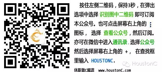 休斯敦C频道 公众号HoustonC 点击上面「HoustonC」即可快速关注
